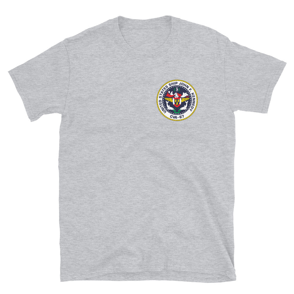 USS John F. Kennedy (CVA-67) Shooters Union Local 67 shirt. It's made of a thicker, heavier cotton, but it's still soft and comfy. And the double stitching on the neckline and sleeves add more durability to what is sure to be a favorite!